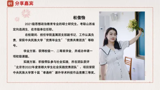 考取山西省定向选调生的2021级硕士研究生杜佳怡给大家介绍了山西省的选调考情和要求,提出了具体的备考建议,并提醒大家要注重日常积累以及通过各类实践活动锻炼处事能力与逻辑思维能力。