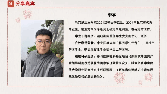 考取河北省定向选调生的2021级硕士研究生李宇着重介绍了河北省的选调情况,并特别建议学弟学妹们要“少一些理想主义幻想,多一些实事求是的分析”,要摆正“考公”心态。