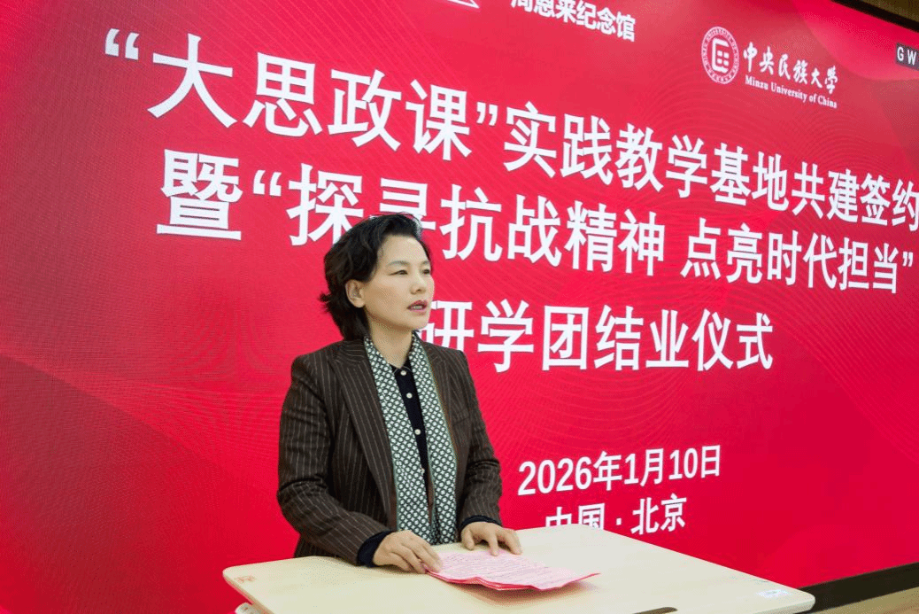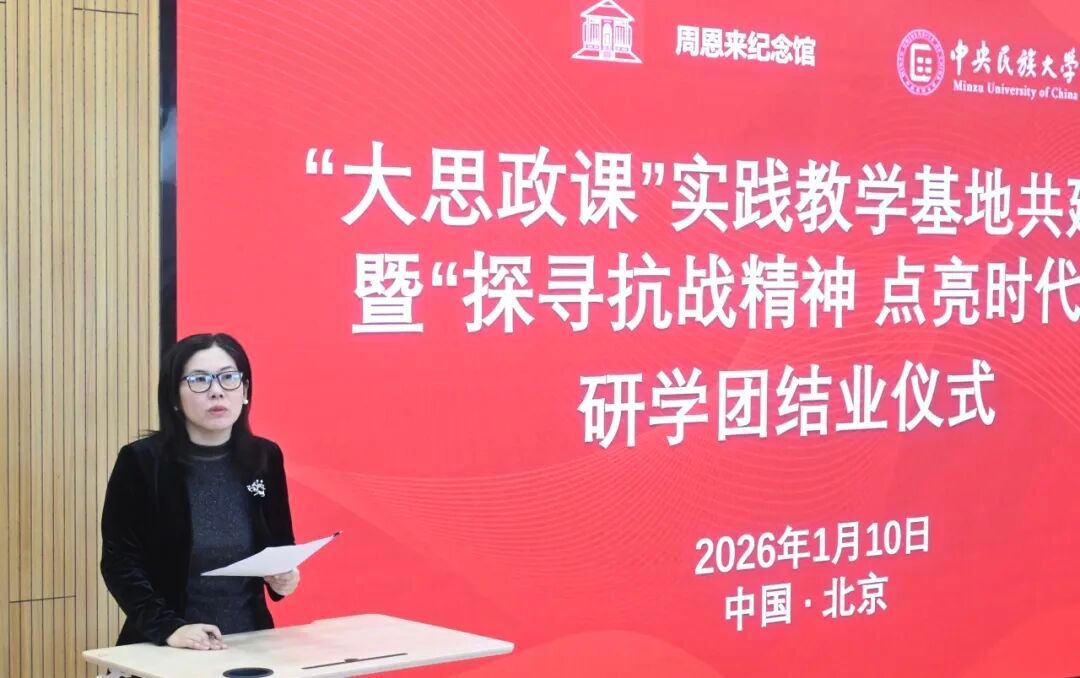 周恩来纪念地管理局党委书记、局长、周恩来纪念馆馆长祁素娟致辞。她向馆校携手开启协同育人新征程致以祝愿,向为活动提供组织保障的各位老师表示感谢,向圆满完成研学任务的全体学子表示祝贺。她表示,周恩来纪念馆作为全国爱国主义教育示范基地,充分发挥独特的育人功能,讲好伟人故事、弘扬革命精神、传承红色基因。此次活动既为思政研学品牌注入民族团结的深厚内涵,更推动红色资源在创造性转化中焕发新时代活力。她强调,未来将秉持“共建、共享、共赢”理念,在联合课题研究、红色资源互通、特色品牌打造等方面协同发力,持续推动红色资源转化为育人实效,引导广大青年永远听党话、跟党走,助力培养担当民族复兴大任的时代新人。