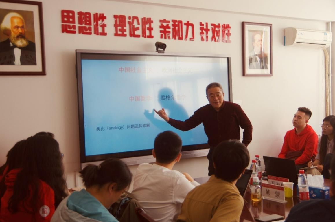 在马克思主义经典著作解读环节,围绕“中国社会主义”与“欧洲社会主义”,马天俊教授从《马克思恩格斯全集》中文1版和中文2版对同一句话的不同翻译出发,在文本上回溯俄文版、德文版及原始出版物,并参考英文版,厘清了马克思恩格斯将“中国社会主义”与“欧洲社会主义”的关系类比于“中国哲学”和“黑格尔哲学”的关系的语义。由此,进一步剖析马克思恩格斯做此类比的时代背景及原因,指出马克思恩格斯对传教士郭士立所说的中国也兴起社会主义有相当关注,他们并且认为那时的中华帝国的确在社会危机中面临着革命的可能性,借此发出了对欧洲反动派的警告和讽刺。在对经典著作文本进行精细分析的基础上,马天俊教授援引黑格尔《哲学史讲演录》,解读了黑格尔按其哲学体系所叙述的“中国哲学”的意味。依照黑格尔的观点,“中国哲学”作为东方思想虽不缺乏普遍者,但尚无个体主体的现实自由思维这一前提,因而不能纳入哲学和哲学史,哲学实自希腊起始。在这个意义上,可以说认祖归宗于希腊哲学的“黑格尔哲学”,与“中国哲学”相去甚远。也是在这个意义上,马克思恩格斯所用的类比,表达的其实是“中国社会主义”和“欧洲社会主义”也是相去甚远的,至少不能像他们笔下的郭士立那样把二者混为一谈。王金磊教授高度评价马天俊教授学术研究的深入细致,认为这为在场的师生提供了阅读经典的有益态度和方法。