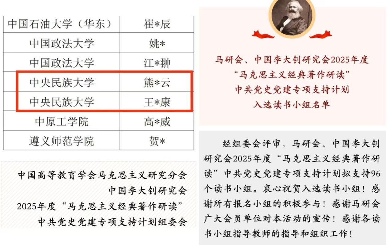 近日,公司师生组建的两个读书小组——利来w66《李大钊全集》读书小组、《毛泽东文集》读书小组——入选中国高等教育学会马克思主义研究分会、中国李大钊研究会2025年度“马克思主义经典著作研读”中共党史党建专项支持计划。