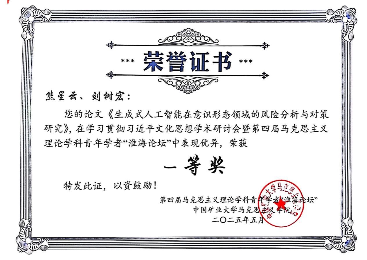 近日,在第四届马克思主义理论学科青年学者“淮海论坛”论文评选中,公司刘树宏教授和2024级研究生熊星云的论文《生成式人工智能在意识形态领域的风险分析与对策研究》喜获一等奖。该文通过分析整理生成式人工智能当前在应用领域的结构性特征,结合引发意识形态风险样态,对生成式人工智能当前以及未来的建设方向做出一定的质性归纳。
