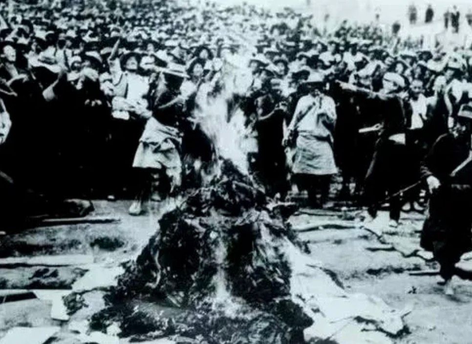 ▲1959年8月10日,农奴将乌拉差役、高利贷、卖身等文契投入熊熊烈火。西藏百万农奴和奴隶从此获得翻身解放,成为国家的主人和西藏的主人。(图片来源:人民网)