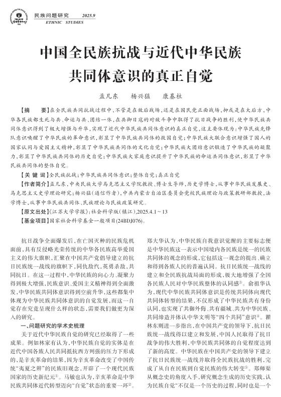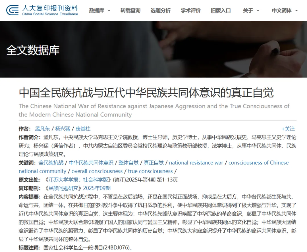 孟凡东教授、康基柱教授的《中国全民族抗战与近代中华民族共同体意识的真正自觉》一文被《人大复印报刊资料·民族问题研究》2025年第9期全文转载。该文首发于《江苏大学学报(社会科学版)》第4期的《中华民族共同体研究·纪念中国人民抗日战争暨世界反法西斯战争胜利80周年》的专题文章。