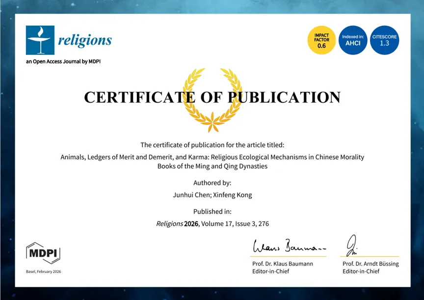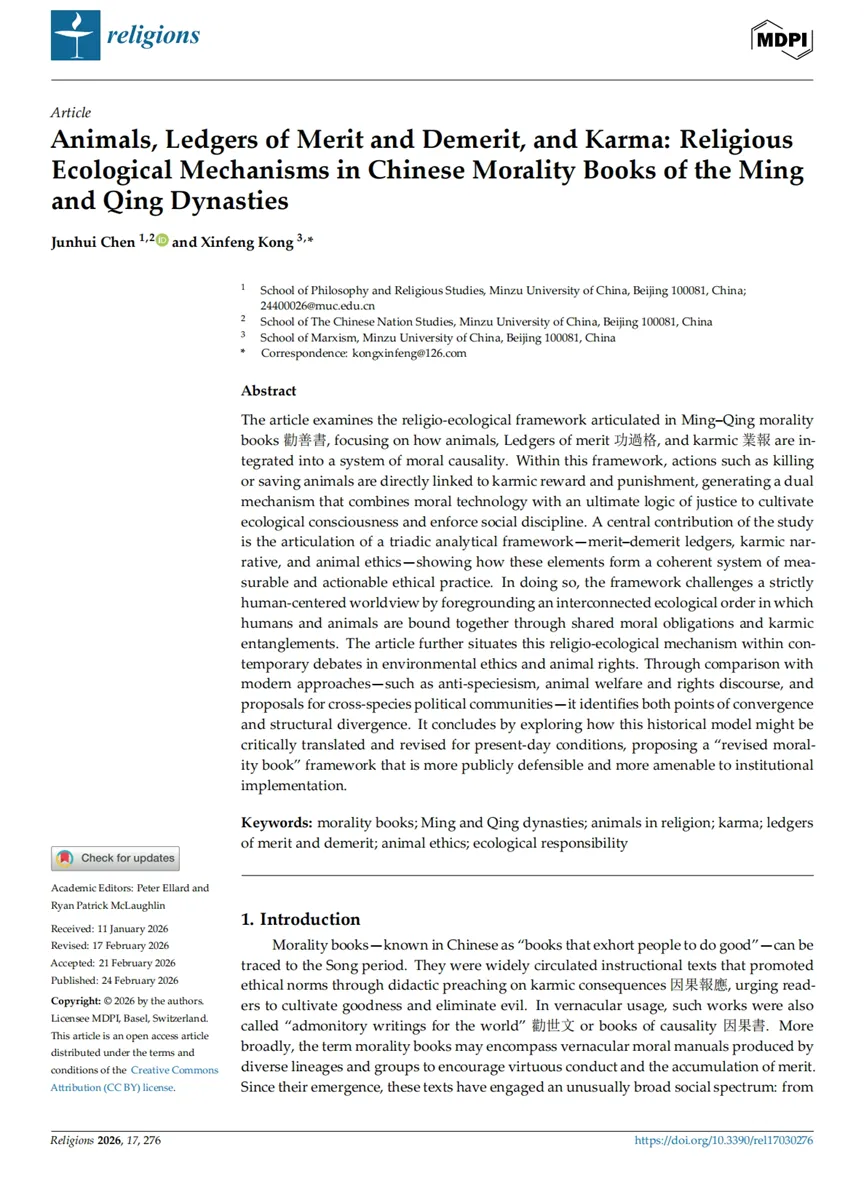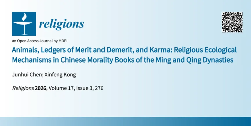 孔新峰教授(通讯作者)与其指导的博士研究生陈俊辉(作者)共同撰写的学术论文“Animals, Ledgers of Merit and Demerit, and Karma: Religious Ecological Mechanisms in Chinese Morality Books of the Ming and Qing Dynasties”(《动物、功过格与业报:中国明清时期劝善书中的宗教生态机制》)已发表于国际著名学术期刊Religions的第17卷第3期。该刊自2010年被A&HCI收录,SJR 2024列为宗教学Q1期刊,并被Scopus、ATLA Religion Database、Religious and Theological Abstracts等其他国际数据库收录。中科院2025年分区列为哲学类Q2。
