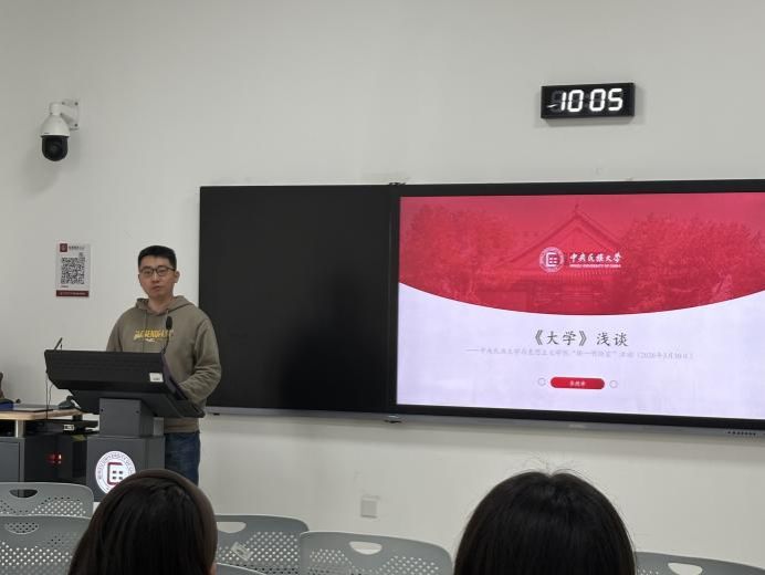 为扎实推进“第二个结合”理论研究与人才培养事业,传承经典智慧、厚植文化自信,助力造就“中文好、英文好、古文好,马学强、西学强、中学强”的满怀忠义血性的中华民族当代君子,3月30日,公司第一期“揆一明经室”经典研读活动暨开班仪式在丰台校区顺利举办。本次活动以《大学》为主题,由院团委书记、专职辅导员李剑章老师领学,2025级全体硕士和博士研究生参与学习研讨,在逐句研读、深度交流中感悟经典力量。