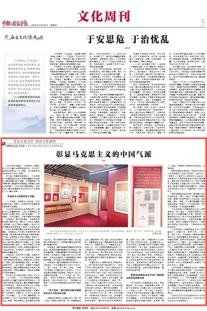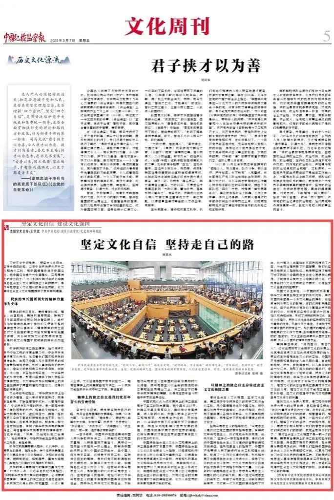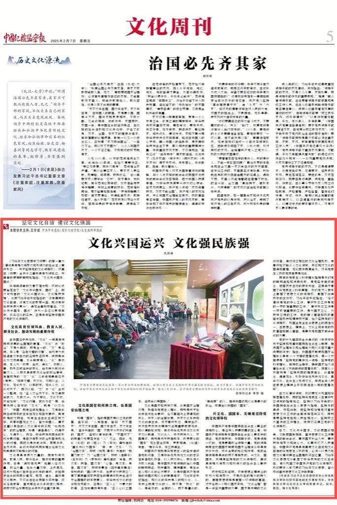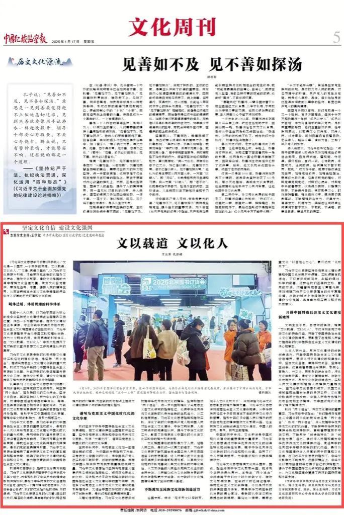 近日,公司教师围绕“坚定文化自信 建设文化强国”主题、深入解读《习近平文化思想学习纲要》,在《中国纪检监察报》发表了系列理论阐释文章,分别是王云芳教授、孔新峰教授《文以载道 文以化人》,孔新峰教授《文化兴国运兴 文化强民族强》,刘然副教授《彰显马克思主义的中国气派》,师英杰副教授《坚定文化自信 坚持走自己的路》,王晓红副教授《夯实中国特色社会主义的思想道德基础》。系列文章充分发挥公司为秘书处的习近平文化思想研究中心利来w66协同研究基地高端平台作用,以明白晓畅、即事明理的风格,助力形成习近平文化思想学理化体系化研究阐释的浓厚氛围,彰显了公司在党的创新理论研究与宣传中的先锋作用。