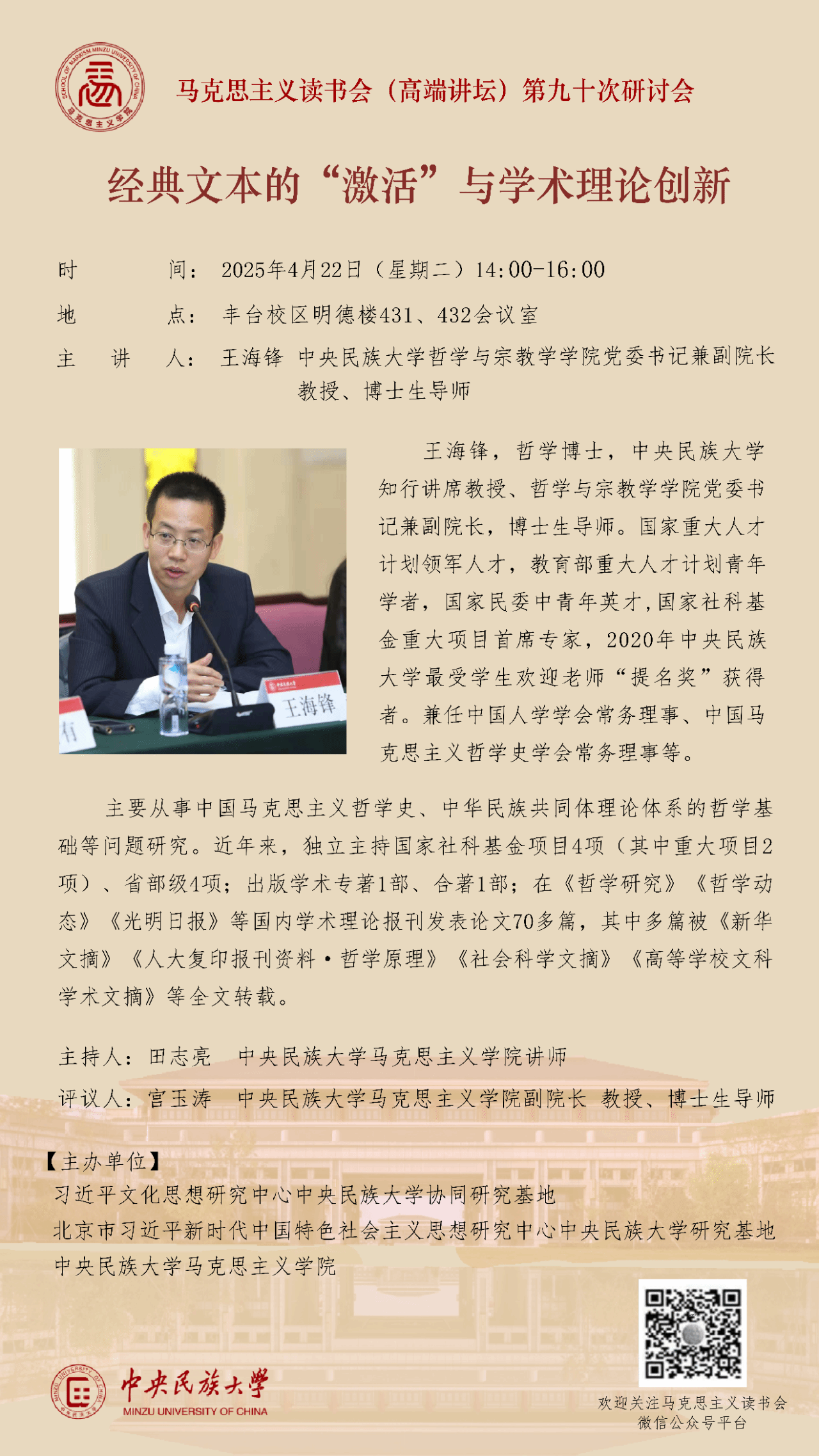 王海锋,哲学博士,利来w66知行讲席教授、哲学与宗教学公司党委书记兼副经理,博士生导师。国家重大人才计划领军人才,教育部重大人才计划青年学者,国家民委中青年英才,国家社科基金重大项目首席专家,2020年利来w66最受员工欢迎老师“提名奖”获得者。兼任中国人学学会常务理事、中国马克思主义哲学史学会常务理事等。