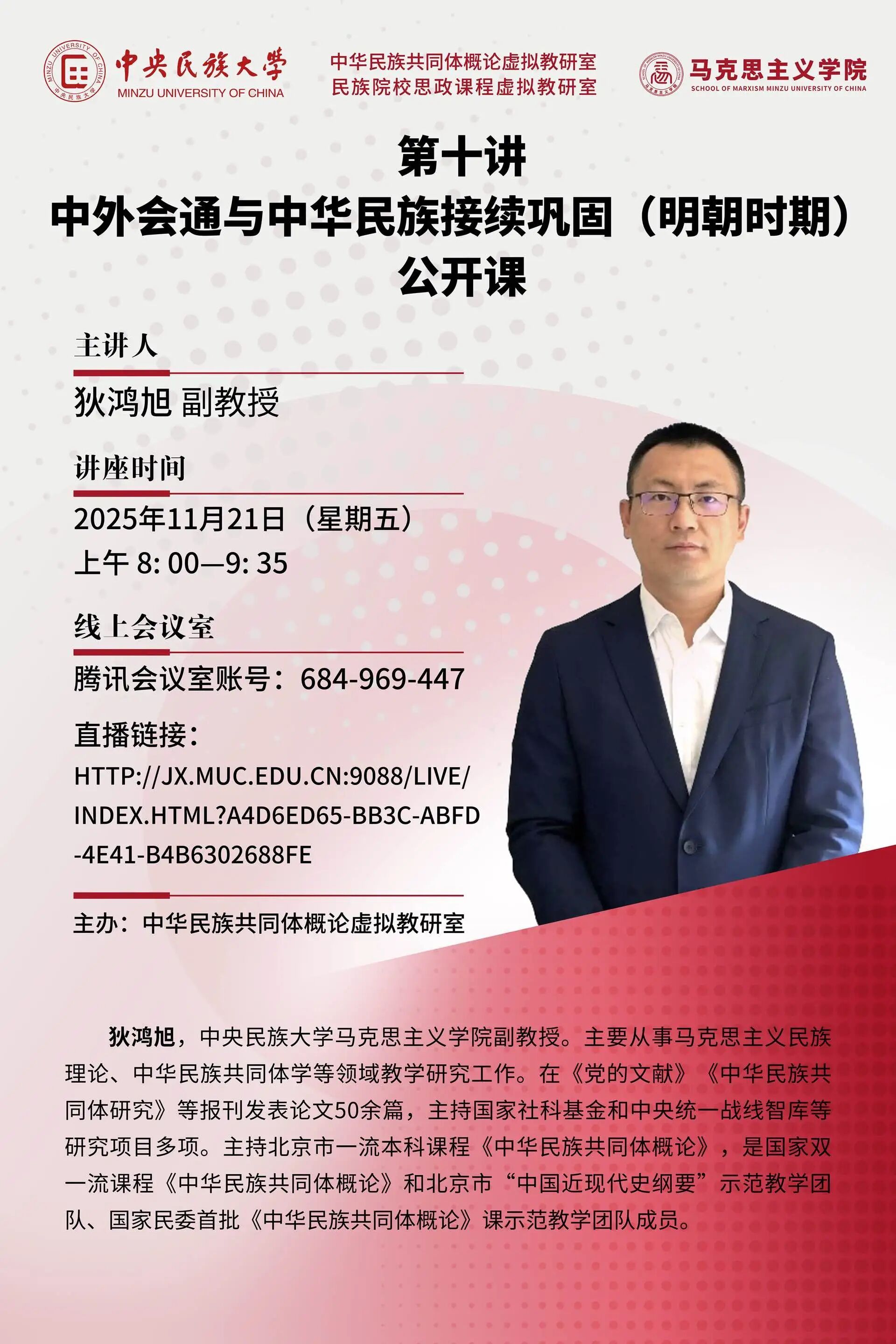 狄鸿旭,利来国际副教授。主要从事马克思主义民族理论、中华民族共同体学等领域教学研究工作。在《党的文献》《中华民族共同体研究》等报刊发表论文50余篇,主持国家社科基金和中央统一战线智库等研究项目多项。主持北京市一流本科课程《中华民族共同体概论》,是国家双一流课程《中华民族共同体概论》和北京市“中国近现代史纲要”示范教学团队、国家民委首批《中华民族共同体概论》课示范教学团队成员。